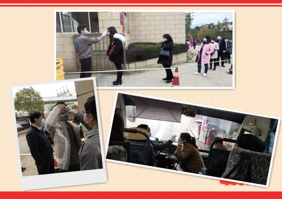 员工乘坐公司通勤车前需进行体温检测,确保无体温异常员工上车,并安排跟车人员为员工发放医用防护口罩;员工进入公司前自觉有序的排队并保持安全距离,进行入司前的二次体温检测,全员全程佩戴医用防护口罩。